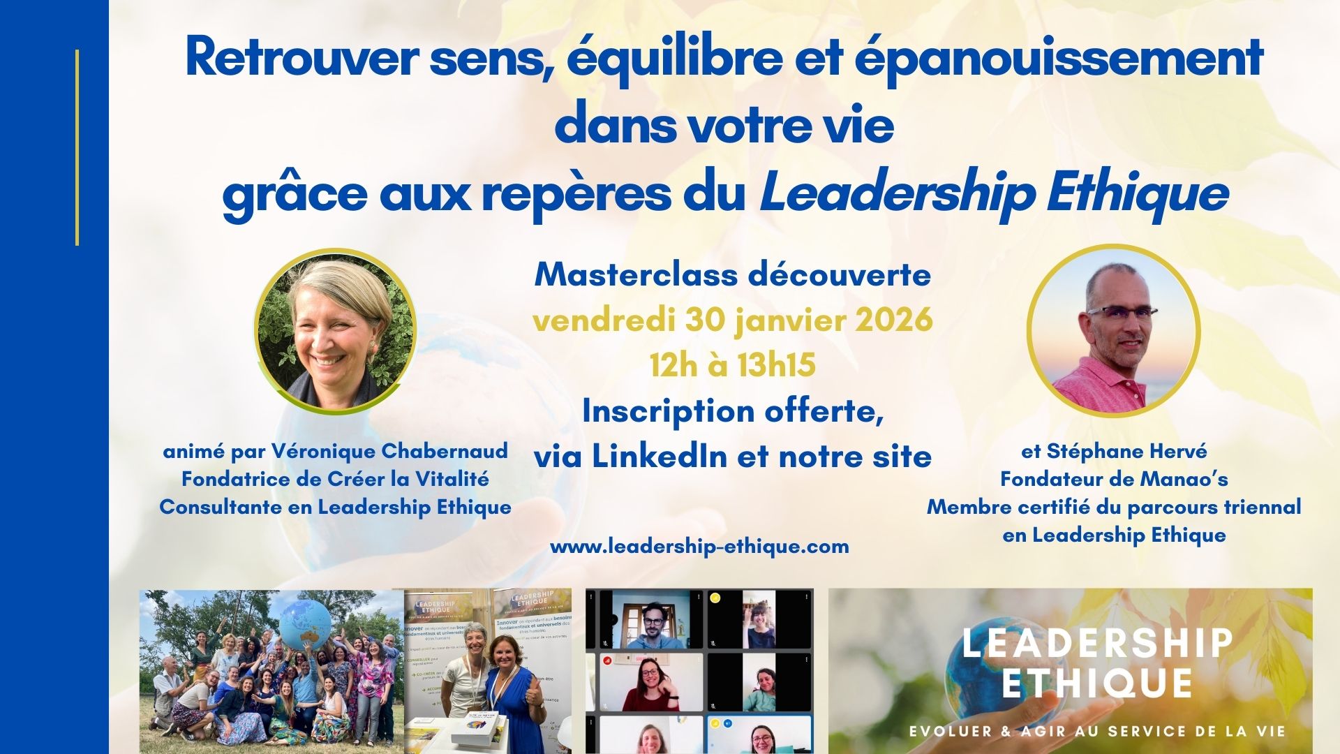 En 1h15, connectez vous facilement grâce à la visio, pour cette session d’information innovante et interactive, pour découvrir l’approche globale, profondément humaniste et 100% logique que représente le Leadership Éthique. L’objectif de cette rencontre est de vous permettre de comprendre et ressentir comment vous aussi, vous pouvez mettre votre plein potentiel davantage 𝗮𝘂 𝘀𝗲𝗿𝘃𝗶𝗰𝗲 𝗱’𝘂𝗻 𝗺𝗼𝗻𝗱𝗲 𝗽𝗹𝘂𝘀 𝗿𝗲𝘀𝗽𝗲𝗰𝘁𝘂𝗲𝘂𝘅 𝗱𝗲𝘀 𝗲̂𝘁𝗿𝗲𝘀 𝗵𝘂𝗺𝗮𝗶𝗻𝘀 𝗲𝘁 𝗱𝗲 𝗹𝗮 𝗽𝗹𝗮𝗻𝗲̀𝘁𝗲 🌍