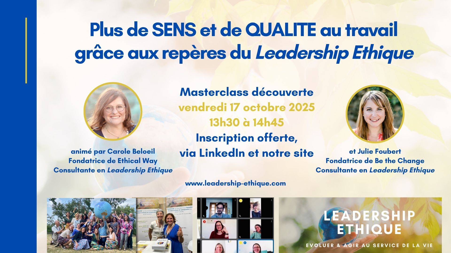 En 1h30, connectez vous facilement grâce à la visio, pour cette session d’information innovante et interactive, pour découvrir l’approche globale, profondément humaniste et 100% logique que représente le Leadership Éthique. L’objectif de cette rencontre est de vous permettre de comprendre et ressentir comment vous aussi, vous pouvez mettre votre plein potentiel davantage 𝗮𝘂 𝘀𝗲𝗿𝘃𝗶𝗰𝗲 𝗱’𝘂𝗻 𝗺𝗼𝗻𝗱𝗲 𝗽𝗹𝘂𝘀 𝗿𝗲𝘀𝗽𝗲𝗰𝘁𝘂𝗲𝘂𝘅 𝗱𝗲𝘀 𝗲̂𝘁𝗿𝗲𝘀 𝗵𝘂𝗺𝗮𝗶𝗻𝘀 𝗲𝘁 𝗱𝗲 𝗹𝗮 𝗽𝗹𝗮𝗻𝗲̀𝘁𝗲 🌍