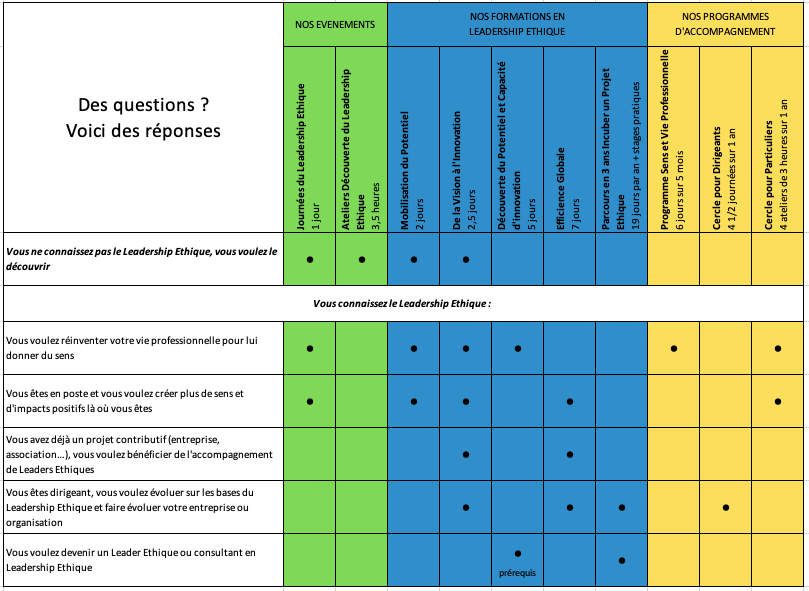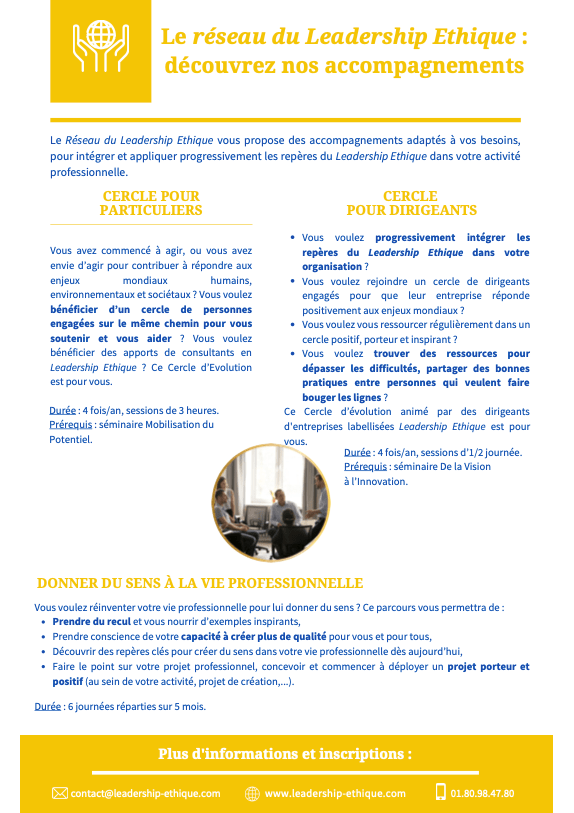 - Les Formations en Leadership Ethique, de 2 à 7 jours : découvrir et expérimenter les fondamentaux du Leadership Ethique pour plus de qualité, de réponses aux enjeux mondiaux et d’impacts positifs dans votre activité professionnelle,